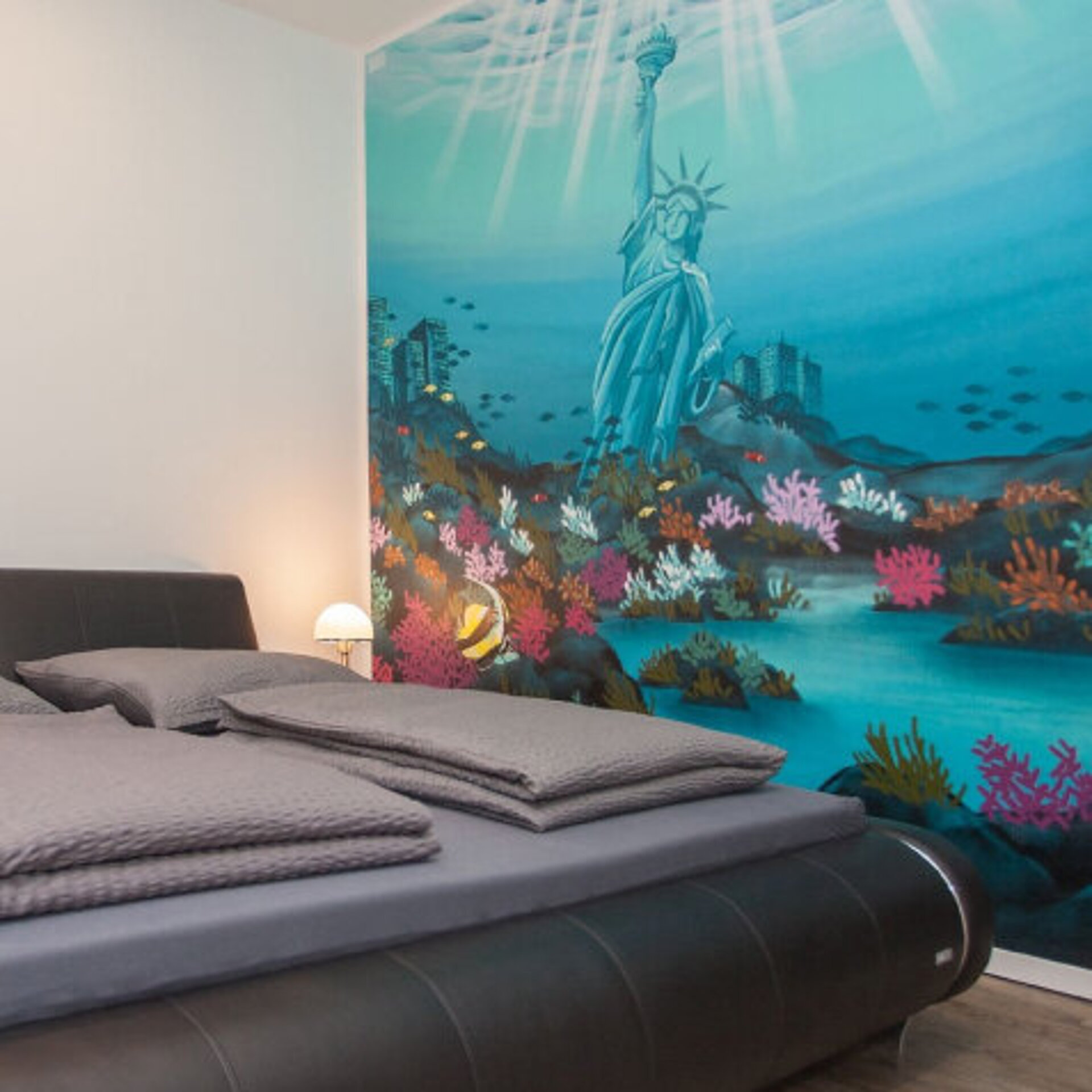 Die Wände vom Apartment hat ein Künstler als Unterwasserlandschaft gestaltet.